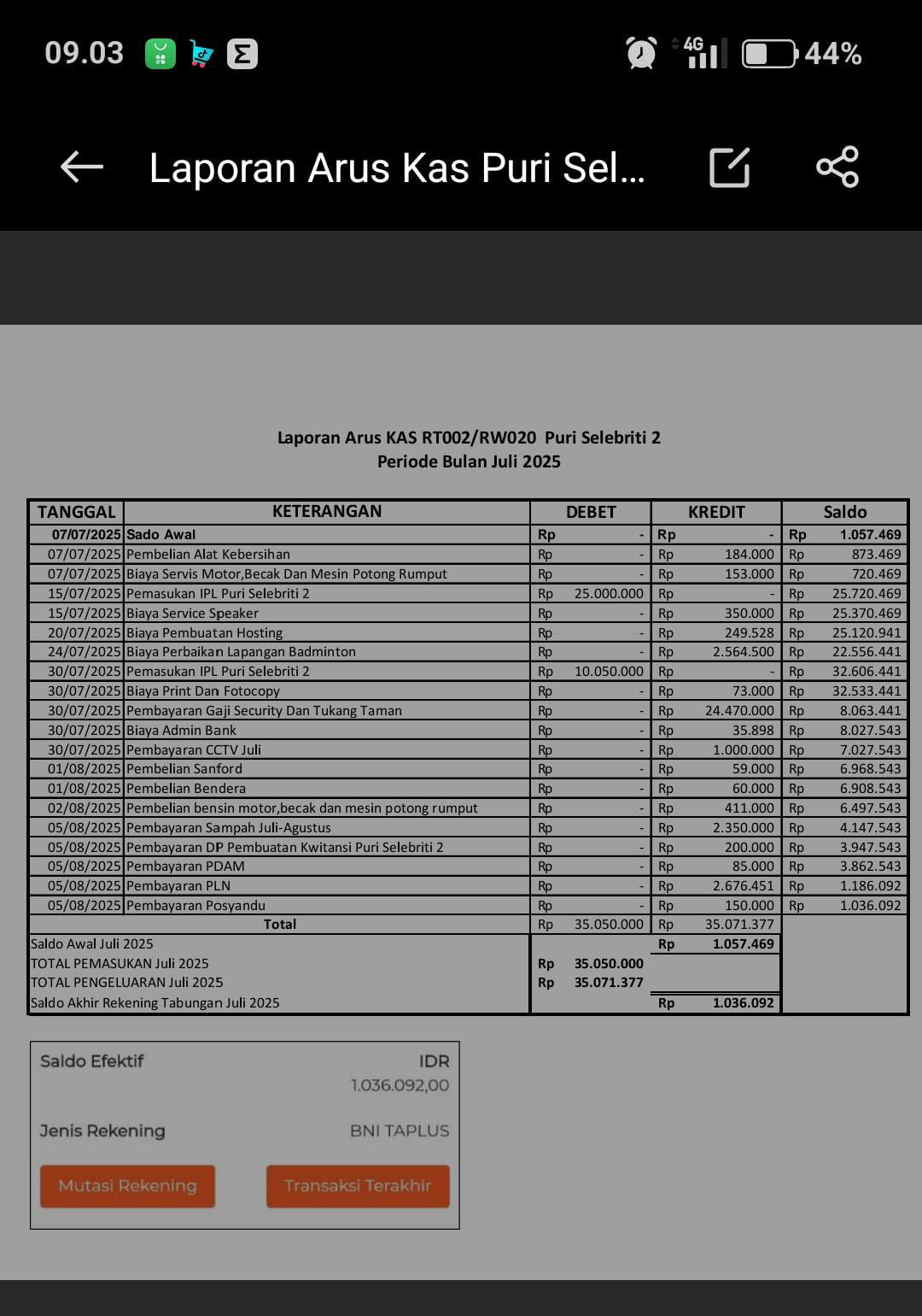 #LaporanKeuangan #RT002RW020 #PuriSelebriti2 #TransparansiKeuangan #Juli2025 #Batam